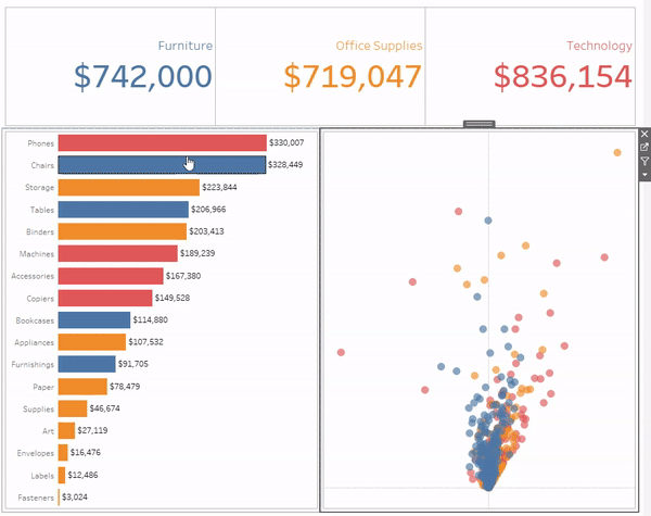 If you’re running an action from any other type of chart, like a bar chart or a scatterplot, I would not recommend using the Transparent Technique. You may be able to get it to work (on a scatterplot at least), but similar to the Buttons use case, there is an easier way. I will always default to the Filter Technique, because I think it provides the best user experience. Again, it may take longer to set up, but in my experience, it’s usually worth it. However, there are times when that is not an option. As I mentioned before, with that technique, you lose the ability to ‘Clear the Selection’. That means no set controls, no filter actions, and extra work for parameter actions. If I’m running a parameter action, I will usually still put in the effort to use the Filter Technique (and use a calculated field in the action to clear the selection). If I’m running a filter action, or using set controls, I will use the Highlight Technique. So my vote here again goes to the Filter Technique (when possible).