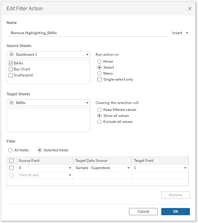 Update your Filter Action. In this example I want to turn off the highlighting on the BANs, so I’ve added the 0 and 1 fields to detail on that worksheet.