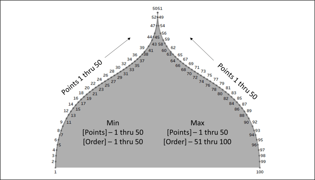 The data source set up for this method is very similar to Method #1, except that it has 600 densification records instead of 100, and we are going to add an additional “table”. This “table” just has 1 field called [Order] and just two records (with values of 1 and 2). Alternatively you could just add this column to the Densification table and have two records for each [Points] value, but it’s a lot easier to increase or decrease the number of densification records (which I do pretty frequently) if you put this in it’s own table. So again, we are going to do a Physical join between our data table and our densification table and then we’ll add another join for our order table (once again using the join calculation).