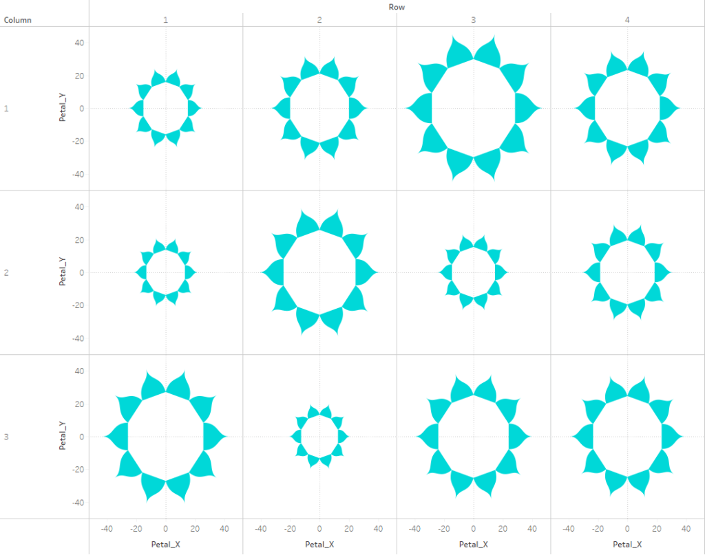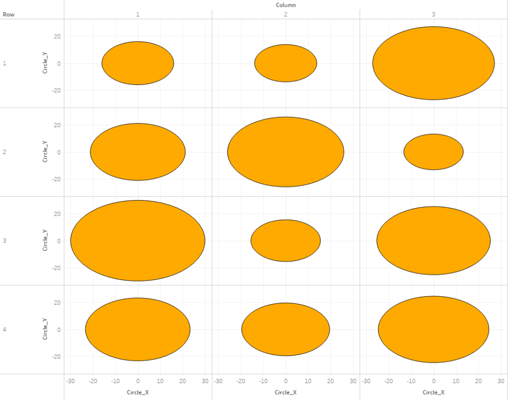 The exact way that you build this is going to depend on how your chart is set up. In this example, we are going to build a simple 3 x 3 Panel chart, using the Size field to determine the size of our “Design Circles”. So to build my panel, I’m going to use some of those extra columns from my data source (row and column, but these could be easily calculated in the workbook instead). I’ll change them both to dimensions and bring them out on to the Rows and Columns shelves respectively.