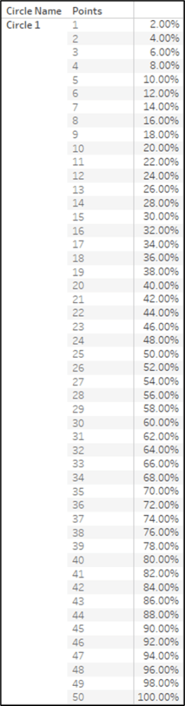 Now we’ll build a calculated field that determines the size of every “Building Circle”. So we already determined that we are going to use the [Size] field to determine the size of our “Design Circles”. So we need our largest “Building Circle” to have that same value. And then we want the size of the rest of our “Building Circles” to get smaller and smaller. In our densification table, we have 100 records with values from 1 to 100. So if we divide each of those values by the maximum value (in our case that’s 100) that will give us percentages from 1% to 100%. And then if we multiply that by our [Size] field, we’ll end up with 100 different values, with the largest value being equal to the [Size] field, and the smallest value being equal to 1% of that value. But note that you do not need exactly 100 records for this to work. Your densification table could have 200 records. The largest circle will still have the same value as the [Size] field, and the smallest would be equal to .5% of that value. Or it could have 1000 records. Or it could have 53,469 records. It doesn’t matter, as long as the numbers in the [Points] field are sequential and you’re dividing each [Points] value by the maximum [Points] value.
